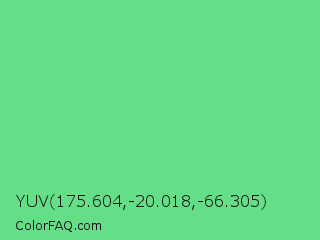 YUV 175.604,-20.018,-66.305 Color is a light green color and the nearest color is Very Light Malachite Green #64e986. Hex code #64de87 and RGB value is rgb(100,222,135). In RGB color space, this color is composed of 39% red, 87% green, 53% blue, In CMYK color space, this color is composed of 55% cyan, 0% magenta, 39% yellow , 13% black , In HSL color space, this color has a hue angle of 137° , 65% saturation and 63% lightness.