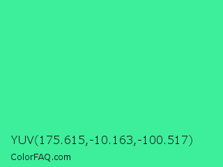 YUV 175.615,-10.163,-100.517 Color is a normal green color and the nearest color is Eucalyptus #44d7a8. Hex code #3dee9b and RGB value is rgb(61,238,155). In RGB color space, this color is composed of 24% red, 93% green, 61% blue, In CMYK color space, this color is composed of 74% cyan, 0% magenta, 35% yellow , 7% black , In HSL color space, this color has a hue angle of 152° , 84% saturation and 59% lightness.
