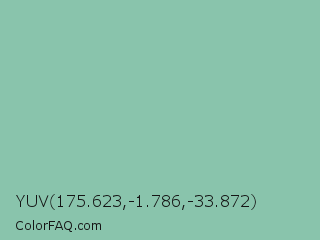 YUV 175.623,-1.786,-33.872 Color is a light green color and the nearest color is Summer Green #96bbab. Hex code #89c4ac and RGB value is rgb(137,196,172). In RGB color space, this color is composed of 54% red, 77% green, 67% blue, In CMYK color space, this color is composed of 30% cyan, 0% magenta, 12% yellow , 23% black , In HSL color space, this color has a hue angle of 156° , 33% saturation and 65% lightness.