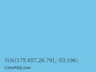 YUV 175.657,26.791,-53.196 Color is a light blue color and the nearest color is Aero #7cb9e8. Hex code #73c4e6 and RGB value is rgb(115,196,230). In RGB color space, this color is composed of 45% red, 77% green, 90% blue, In CMYK color space, this color is composed of 50% cyan, 15% magenta, 0% yellow , 10% black , In HSL color space, this color has a hue angle of 198° , 70% saturation and 68% lightness.