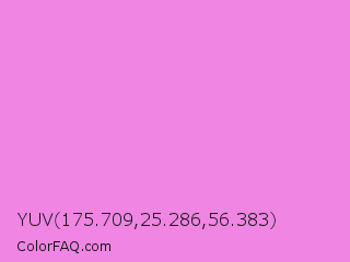 YUV 175.709,25.286,56.383 Color is a light magenta color and the nearest color is Pale Magenta #f984e5. Hex code #f085e3 and RGB value is rgb(240,133,227). In RGB color space, this color is composed of 94% red, 52% green, 89% blue, In CMYK color space, this color is composed of 0% cyan, 45% magenta, 5% yellow , 6% black , In HSL color space, this color has a hue angle of 307° , 78% saturation and 73% lightness.