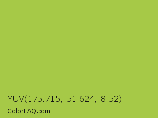 YUV 175.715,-51.624,-8.52 Color is a normal lime color and the nearest color is Android Green #a4c639. Hex code #a6c947 and RGB value is rgb(166,201,71). In RGB color space, this color is composed of 65% red, 79% green, 28% blue, In CMYK color space, this color is composed of 17% cyan, 0% magenta, 65% yellow , 21% black , In HSL color space, this color has a hue angle of 76° , 55% saturation and 53% lightness.