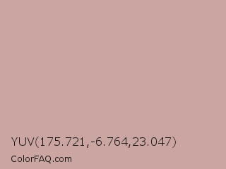 YUV 175.721,-6.764,23.047 Color is a light red color and the nearest color is Eunry #cfa39d. Hex code #caa5a2 and RGB value is rgb(202,165,162). In RGB color space, this color is composed of 79% red, 65% green, 64% blue, In CMYK color space, this color is composed of 0% cyan, 18% magenta, 20% yellow , 21% black , In HSL color space, this color has a hue angle of 5° , 27% saturation and 71% lightness.