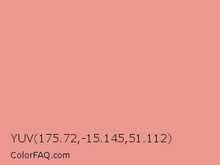 YUV 175.72,-15.145,51.112 Color is a light red color and the nearest color is Tonys Pink #e79f8c. Hex code #ea9891 and RGB value is rgb(234,152,145). In RGB color space, this color is composed of 92% red, 60% green, 57% blue, In CMYK color space, this color is composed of 0% cyan, 35% magenta, 38% yellow , 8% black , In HSL color space, this color has a hue angle of 5° , 68% saturation and 74% lightness.