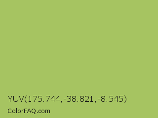 YUV 175.744,-38.821,-8.545 Color is a normal lime color and the nearest color is Middle Green Yellow #acbf60. Hex code #a6c461 and RGB value is rgb(166,196,97). In RGB color space, this color is composed of 65% red, 77% green, 38% blue, In CMYK color space, this color is composed of 15% cyan, 0% magenta, 51% yellow , 23% black , In HSL color space, this color has a hue angle of 78° , 46% saturation and 57% lightness.