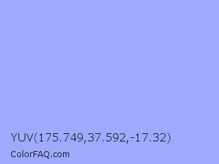 YUV 175.749,37.592,-17.32 Color is a light blue color and the nearest color is Portage #8b9fee. Hex code #9cabfc and RGB value is rgb(156,171,252). In RGB color space, this color is composed of 61% red, 67% green, 99% blue, In CMYK color space, this color is composed of 38% cyan, 32% magenta, 0% yellow , 1% black , In HSL color space, this color has a hue angle of 231° , 94% saturation and 80% lightness.