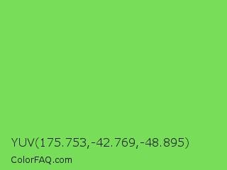 YUV 175.753,-42.769,-48.895 Color is a light green color and the nearest color is Mantis #74c365. Hex code #78dd59 and RGB value is rgb(120,221,89). In RGB color space, this color is composed of 47% red, 87% green, 35% blue, In CMYK color space, this color is composed of 46% cyan, 0% magenta, 60% yellow , 13% black , In HSL color space, this color has a hue angle of 106° , 66% saturation and 61% lightness.