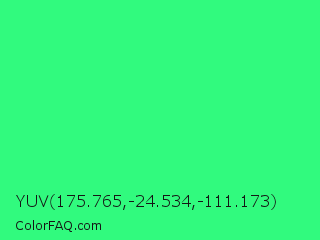 YUV 175.765,-24.534,-111.173 Color is a normal green color and the nearest color is UFO Green #3cd070. Hex code #31fa7e and RGB value is rgb(49,250,126). In RGB color space, this color is composed of 19% red, 98% green, 49% blue, In CMYK color space, this color is composed of 80% cyan, 0% magenta, 50% yellow , 2% black , In HSL color space, this color has a hue angle of 143° , 95% saturation and 59% lightness.