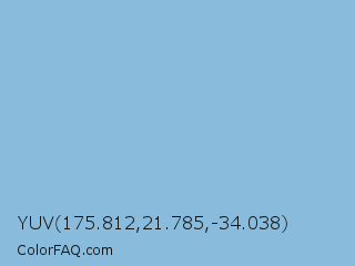 YUV 175.812,21.785,-34.038 Color is a light blue color and the nearest color is Dark Sky Blue #8cbed6. Hex code #89bbdc and RGB value is rgb(137,187,220). In RGB color space, this color is composed of 54% red, 73% green, 86% blue, In CMYK color space, this color is composed of 38% cyan, 15% magenta, 0% yellow , 14% black , In HSL color space, this color has a hue angle of 204° , 54% saturation and 70% lightness.
