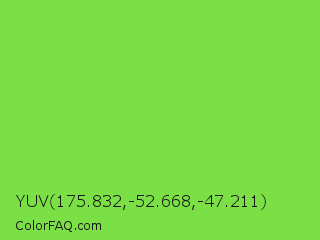 YUV 175.832,-52.668,-47.211 Color is a normal green color and the nearest color is Kiwi #8ee53f. Hex code #7ae045 and RGB value is rgb(122,224,69). In RGB color space, this color is composed of 48% red, 88% green, 27% blue, In CMYK color space, this color is composed of 46% cyan, 0% magenta, 69% yellow , 12% black , In HSL color space, this color has a hue angle of 99° , 71% saturation and 57% lightness.