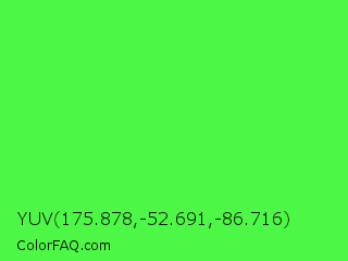 YUV 175.878,-52.691,-86.716 Color is a light green color and the nearest color is Screamin Green #66ff66. Hex code #4df745 and RGB value is rgb(77,247,69). In RGB color space, this color is composed of 30% red, 97% green, 27% blue, In CMYK color space, this color is composed of 69% cyan, 0% magenta, 72% yellow , 3% black , In HSL color space, this color has a hue angle of 117° , 92% saturation and 62% lightness.