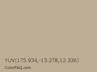YUV 175.934,-13.278,12.336 Color is a light orange color and the nearest color is Indian Khaki #c3b091. Hex code #beae95 and RGB value is rgb(190,174,149). In RGB color space, this color is composed of 75% red, 68% green, 58% blue, In CMYK color space, this color is composed of 0% cyan, 8% magenta, 22% yellow , 25% black , In HSL color space, this color has a hue angle of 37° , 24% saturation and 66% lightness.