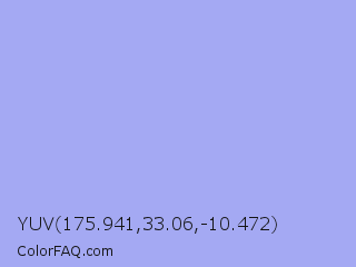 YUV 175.941,33.06,-10.472 Color is a light blue color and the nearest color is Maximum Blue Purple #acace6. Hex code #a4a9f3 and RGB value is rgb(164,169,243). In RGB color space, this color is composed of 64% red, 66% green, 95% blue, In CMYK color space, this color is composed of 33% cyan, 30% magenta, 0% yellow , 5% black , In HSL color space, this color has a hue angle of 236° , 77% saturation and 80% lightness.