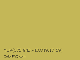 YUV 175.943,-43.849,17.59 Color is a normal yellow color and the nearest color is Vegas Gold #c5b358. Hex code #c4b757 and RGB value is rgb(196,183,87). In RGB color space, this color is composed of 77% red, 72% green, 34% blue, In CMYK color space, this color is composed of 0% cyan, 7% magenta, 56% yellow , 23% black , In HSL color space, this color has a hue angle of 53° , 48% saturation and 55% lightness.