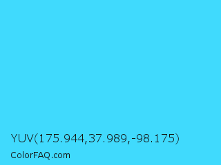 YUV 175.944,37.989,-98.175 Color is a light cyan color and the nearest color is Turquoise #40e0d0. Hex code #40dafd and RGB value is rgb(64,218,253). In RGB color space, this color is composed of 25% red, 85% green, 99% blue, In CMYK color space, this color is composed of 75% cyan, 14% magenta, 0% yellow , 1% black , In HSL color space, this color has a hue angle of 191° , 98% saturation and 62% lightness.