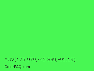 YUV 175.979,-45.839,-91.19 Color is a light green color and the nearest color is Screamin Green #66ff66. Hex code #48f753 and RGB value is rgb(72,247,83). In RGB color space, this color is composed of 28% red, 97% green, 33% blue, In CMYK color space, this color is composed of 71% cyan, 0% magenta, 66% yellow , 3% black , In HSL color space, this color has a hue angle of 124° , 92% saturation and 63% lightness.