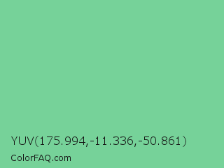 YUV 175.994,-11.336,-50.861 Color is a light green color and the nearest color is De York #7ac488. Hex code #76d299 and RGB value is rgb(118,210,153). In RGB color space, this color is composed of 46% red, 82% green, 60% blue, In CMYK color space, this color is composed of 44% cyan, 0% magenta, 27% yellow , 18% black , In HSL color space, this color has a hue angle of 143° , 51% saturation and 64% lightness.