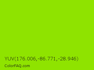 YUV 176.006,-86.771,-28.946 Color is a normal green color and the nearest color is Alien Armpit #84de02. Hex code #8fe300 and RGB value is rgb(143,227,-0). In RGB color space, this color is composed of 56% red, 89% green, 0% blue, In CMYK color space, this color is composed of 37% cyan, 0% magenta, 100% yellow , 11% black , In HSL color space, this color has a hue angle of 82° , 100% saturation and 45% lightness.