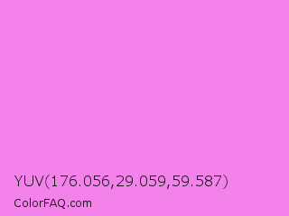 YUV 176.056,29.059,59.587 Color is a light magenta color and the nearest color is Light Fuchsia Pink #f984ef. Hex code #f482eb and RGB value is rgb(244,130,235). In RGB color space, this color is composed of 96% red, 51% green, 92% blue, In CMYK color space, this color is composed of 0% cyan, 47% magenta, 4% yellow , 4% black , In HSL color space, this color has a hue angle of 305° , 84% saturation and 73% lightness.