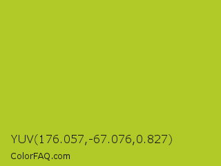 YUV 176.057,-67.076,0.827 Color is a normal yellow color and the nearest color is Key Lime Pie #bfc921. Hex code #b1ca28 and RGB value is rgb(177,202,40). In RGB color space, this color is composed of 69% red, 79% green, 16% blue, In CMYK color space, this color is composed of 12% cyan, 0% magenta, 80% yellow , 21% black , In HSL color space, this color has a hue angle of 69° , 67% saturation and 47% lightness.