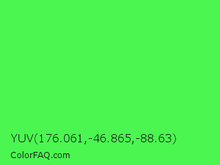 YUV 176.061,-46.865,-88.63 Color is a light green color and the nearest color is Screamin Green #66ff66. Hex code #4bf651 and RGB value is rgb(75,246,81). In RGB color space, this color is composed of 29% red, 96% green, 32% blue, In CMYK color space, this color is composed of 70% cyan, 0% magenta, 67% yellow , 4% black , In HSL color space, this color has a hue angle of 122° , 90% saturation and 63% lightness.
