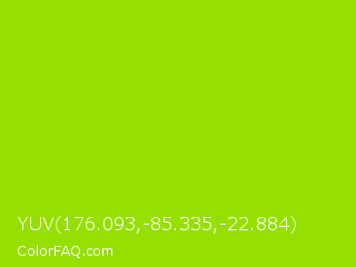 YUV 176.093,-85.335,-22.884 Color is a normal green color and the nearest color is Sheen Green #8fd400. Hex code #96df03 and RGB value is rgb(150,223,3). In RGB color space, this color is composed of 59% red, 87% green, 1% blue, In CMYK color space, this color is composed of 33% cyan, 0% magenta, 99% yellow , 13% black , In HSL color space, this color has a hue angle of 80° , 97% saturation and 44% lightness.