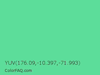 YUV 176.09,-10.397,-71.993 Color is a light green color and the nearest color is Medium Aquamarine #66ddaa. Hex code #5ede9b and RGB value is rgb(94,222,155). In RGB color space, this color is composed of 37% red, 87% green, 61% blue, In CMYK color space, this color is composed of 58% cyan, 0% magenta, 30% yellow , 13% black , In HSL color space, this color has a hue angle of 149° , 66% saturation and 62% lightness.