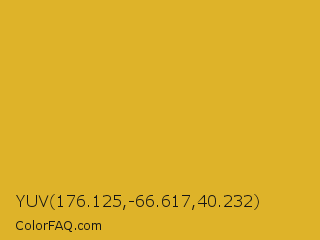 YUV 176.125,-66.617,40.232 Color is a normal yellow color and the nearest color is Urobilin #e1ad21. Hex code #deb329 and RGB value is rgb(222,179,41). In RGB color space, this color is composed of 87% red, 70% green, 16% blue, In CMYK color space, this color is composed of 0% cyan, 19% magenta, 82% yellow , 13% black , In HSL color space, this color has a hue angle of 46° , 73% saturation and 52% lightness.