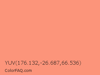 YUV 176.132,-26.687,66.536 Color is a light red color and the nearest color is Vivid Tangerine #ff9980. Hex code #fc947a and RGB value is rgb(252,148,122). In RGB color space, this color is composed of 99% red, 58% green, 48% blue, In CMYK color space, this color is composed of 0% cyan, 41% magenta, 52% yellow , 1% black , In HSL color space, this color has a hue angle of 12° , 96% saturation and 73% lightness.
