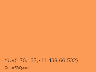 YUV 176.137,-44.438,66.532 Color is a light orange color and the nearest color is Tan Hide #fa9d5a. Hex code #fc9b56 and RGB value is rgb(252,155,86). In RGB color space, this color is composed of 99% red, 61% green, 34% blue, In CMYK color space, this color is composed of 0% cyan, 38% magenta, 66% yellow , 1% black , In HSL color space, this color has a hue angle of 25° , 97% saturation and 66% lightness.