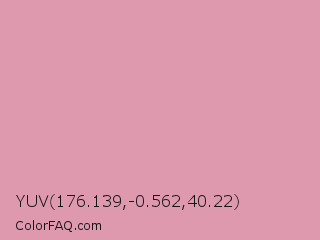 YUV 176.139,-0.562,40.22 Color is a light rose color and the nearest color is Light Thulian Pink #e68fac. Hex code #de99af and RGB value is rgb(222,153,175). In RGB color space, this color is composed of 87% red, 60% green, 69% blue, In CMYK color space, this color is composed of 0% cyan, 31% magenta, 21% yellow , 13% black , In HSL color space, this color has a hue angle of 341° , 51% saturation and 74% lightness.