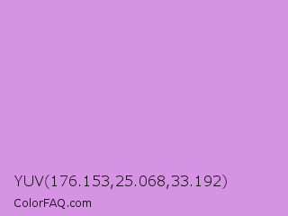 YUV 176.153,25.068,33.192 Color is a light purple color and the nearest color is Bright Lilac #d891ef. Hex code #d693e3 and RGB value is rgb(214,147,227). In RGB color space, this color is composed of 84% red, 58% green, 89% blue, In CMYK color space, this color is composed of 6% cyan, 35% magenta, 0% yellow , 11% black , In HSL color space, this color has a hue angle of 290° , 59% saturation and 73% lightness.