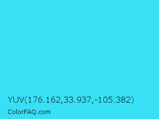 YUV 176.162,33.937,-105.382 Color is a normal cyan color and the nearest color is Turquoise #40e0d0. Hex code #38e0f5 and RGB value is rgb(56,224,245). In RGB color space, this color is composed of 22% red, 88% green, 96% blue, In CMYK color space, this color is composed of 77% cyan, 9% magenta, 0% yellow , 4% black , In HSL color space, this color has a hue angle of 187° , 90% saturation and 59% lightness.