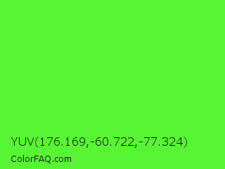YUV 176.169,-60.722,-77.324 Color is a normal green color and the nearest color is Neon Green #39ff14. Hex code #58f535 and RGB value is rgb(88,245,53). In RGB color space, this color is composed of 35% red, 96% green, 21% blue, In CMYK color space, this color is composed of 64% cyan, 0% magenta, 78% yellow , 4% black , In HSL color space, this color has a hue angle of 109° , 91% saturation and 58% lightness.