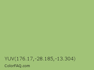 YUV 176.17,-28.185,-13.304 Color is a light green color and the nearest color is Olivine #9ab973. Hex code #a1c377 and RGB value is rgb(161,195,119). In RGB color space, this color is composed of 63% red, 76% green, 47% blue, In CMYK color space, this color is composed of 17% cyan, 0% magenta, 39% yellow , 24% black , In HSL color space, this color has a hue angle of 87° , 39% saturation and 62% lightness.