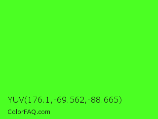 YUV 176.1,-69.562,-88.665 Color is a normal green color and the nearest color is Neon Green #39ff14. Hex code #4bff23 and RGB value is rgb(75,255,35). In RGB color space, this color is composed of 29% red, 100% green, 14% blue, In CMYK color space, this color is composed of 71% cyan, 0% magenta, 86% yellow , 0% black , In HSL color space, this color has a hue angle of 109° , 100% saturation and 57% lightness.