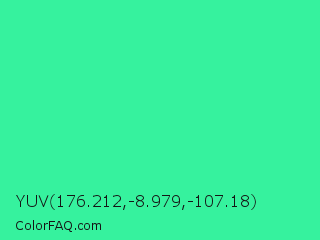 YUV 176.212,-8.979,-107.18 Color is a normal green color and the nearest color is Eucalyptus #44d7a8. Hex code #36f29e and RGB value is rgb(54,242,158). In RGB color space, this color is composed of 21% red, 95% green, 62% blue, In CMYK color space, this color is composed of 78% cyan, 0% magenta, 35% yellow , 5% black , In HSL color space, this color has a hue angle of 153° , 88% saturation and 58% lightness.