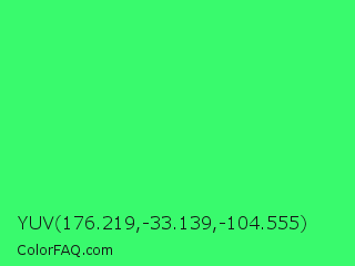 YUV 176.219,-33.139,-104.555 Color is a normal green color and the nearest color is UFO Green #3cd070. Hex code #39fa6d and RGB value is rgb(57,250,109). In RGB color space, this color is composed of 22% red, 98% green, 43% blue, In CMYK color space, this color is composed of 77% cyan, 0% magenta, 56% yellow , 2% black , In HSL color space, this color has a hue angle of 136° , 95% saturation and 60% lightness.