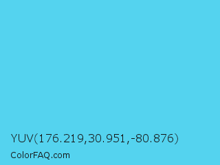 YUV 176.219,30.951,-80.876 Color is a light cyan color and the nearest color is Turquoise Blue #6cdae7. Hex code #54d3ef and RGB value is rgb(84,211,239). In RGB color space, this color is composed of 33% red, 83% green, 94% blue, In CMYK color space, this color is composed of 65% cyan, 12% magenta, 0% yellow , 6% black , In HSL color space, this color has a hue angle of 191° , 83% saturation and 63% lightness.