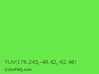 YUV 176.243,-49.42,-62.48 Color is a normal green color and the nearest color is Screamin Green #66ff66. Hex code #69e84c and RGB value is rgb(105,232,76). In RGB color space, this color is composed of 41% red, 91% green, 30% blue, In CMYK color space, this color is composed of 55% cyan, 0% magenta, 67% yellow , 9% black , In HSL color space, this color has a hue angle of 109° , 77% saturation and 60% lightness.