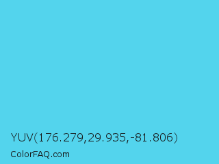YUV 176.279,29.935,-81.806 Color is a light cyan color and the nearest color is Viking #64ccdb. Hex code #53d4ed and RGB value is rgb(83,212,237). In RGB color space, this color is composed of 33% red, 83% green, 93% blue, In CMYK color space, this color is composed of 65% cyan, 11% magenta, 0% yellow , 7% black , In HSL color space, this color has a hue angle of 190° , 81% saturation and 63% lightness.