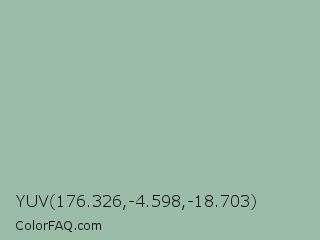 YUV 176.326,-4.598,-18.703 Color is a light green color and the nearest color is Summer Green #96bbab. Hex code #9bbda7 and RGB value is rgb(155,189,167). In RGB color space, this color is composed of 61% red, 74% green, 65% blue, In CMYK color space, this color is composed of 18% cyan, 0% magenta, 12% yellow , 26% black , In HSL color space, this color has a hue angle of 141° , 20% saturation and 67% lightness.