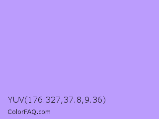 YUV 176.327,37.8,9.36 Color is a light indigo color and the nearest color is Pale Violet #cc99ff. Hex code #bb9cfd and RGB value is rgb(187,156,253). In RGB color space, this color is composed of 73% red, 61% green, 99% blue, In CMYK color space, this color is composed of 26% cyan, 38% magenta, 0% yellow , 1% black , In HSL color space, this color has a hue angle of 259° , 96% saturation and 80% lightness.