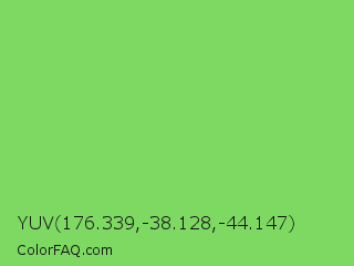YUV 176.339,-38.128,-44.147 Color is a light green color and the nearest color is Pastel Green #77dd77. Hex code #7ed963 and RGB value is rgb(126,217,99). In RGB color space, this color is composed of 49% red, 85% green, 39% blue, In CMYK color space, this color is composed of 42% cyan, 0% magenta, 54% yellow , 15% black , In HSL color space, this color has a hue angle of 106° , 61% saturation and 62% lightness.
