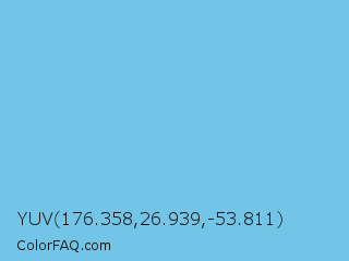 YUV 176.358,26.939,-53.811 Color is a light blue color and the nearest color is Aero #7cb9e8. Hex code #73c5e7 and RGB value is rgb(115,197,231). In RGB color space, this color is composed of 45% red, 77% green, 91% blue, In CMYK color space, this color is composed of 50% cyan, 15% magenta, 0% yellow , 9% black , In HSL color space, this color has a hue angle of 198° , 71% saturation and 68% lightness.