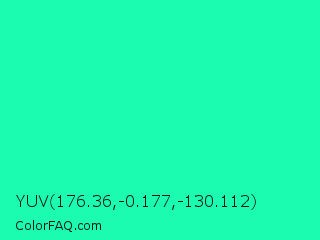 YUV 176.36,-0.177,-130.112 Color is a normal green color and the nearest color is Medium Spring Green #00fa9a. Hex code #1cfcb0 and RGB value is rgb(28,252,176). In RGB color space, this color is composed of 11% red, 99% green, 69% blue, In CMYK color space, this color is composed of 89% cyan, 0% magenta, 30% yellow , 1% black , In HSL color space, this color has a hue angle of 160° , 97% saturation and 55% lightness.