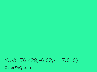 YUV 176.428,-6.62,-117.016 Color is a normal green color and the nearest color is Eucalyptus #44d7a8. Hex code #2bf7a3 and RGB value is rgb(43,247,163). In RGB color space, this color is composed of 17% red, 97% green, 64% blue, In CMYK color space, this color is composed of 83% cyan, 0% magenta, 34% yellow , 3% black , In HSL color space, this color has a hue angle of 155° , 93% saturation and 57% lightness.