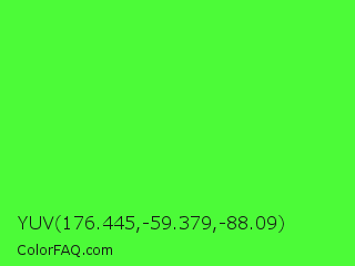 YUV 176.445,-59.379,-88.09 Color is a normal green color and the nearest color is Neon Green #39ff14. Hex code #4cfb38 and RGB value is rgb(76,251,56). In RGB color space, this color is composed of 30% red, 98% green, 22% blue, In CMYK color space, this color is composed of 70% cyan, 0% magenta, 78% yellow , 2% black , In HSL color space, this color has a hue angle of 114° , 96% saturation and 60% lightness.