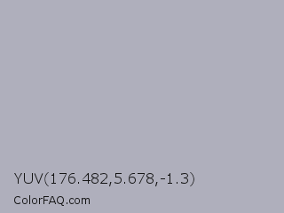 YUV 176.482,5.678,-1.3 Color is a light blue color and the nearest color is Bombay #afb1b8. Hex code #afafbc and RGB value is rgb(175,175,188). In RGB color space, this color is composed of 69% red, 69% green, 74% blue, In CMYK color space, this color is composed of 7% cyan, 7% magenta, 0% yellow , 26% black , In HSL color space, this color has a hue angle of 240° , 9% saturation and 71% lightness.