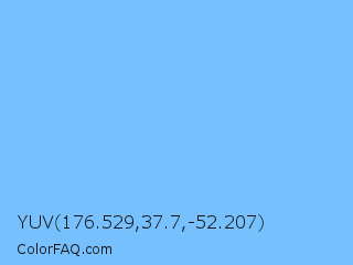 YUV 176.529,37.7,-52.207 Color is a light blue color and the nearest color is Maya Blue #73c2fb. Hex code #75c0fd and RGB value is rgb(117,192,253). In RGB color space, this color is composed of 46% red, 75% green, 99% blue, In CMYK color space, this color is composed of 54% cyan, 24% magenta, 0% yellow , 1% black , In HSL color space, this color has a hue angle of 207° , 97% saturation and 73% lightness.